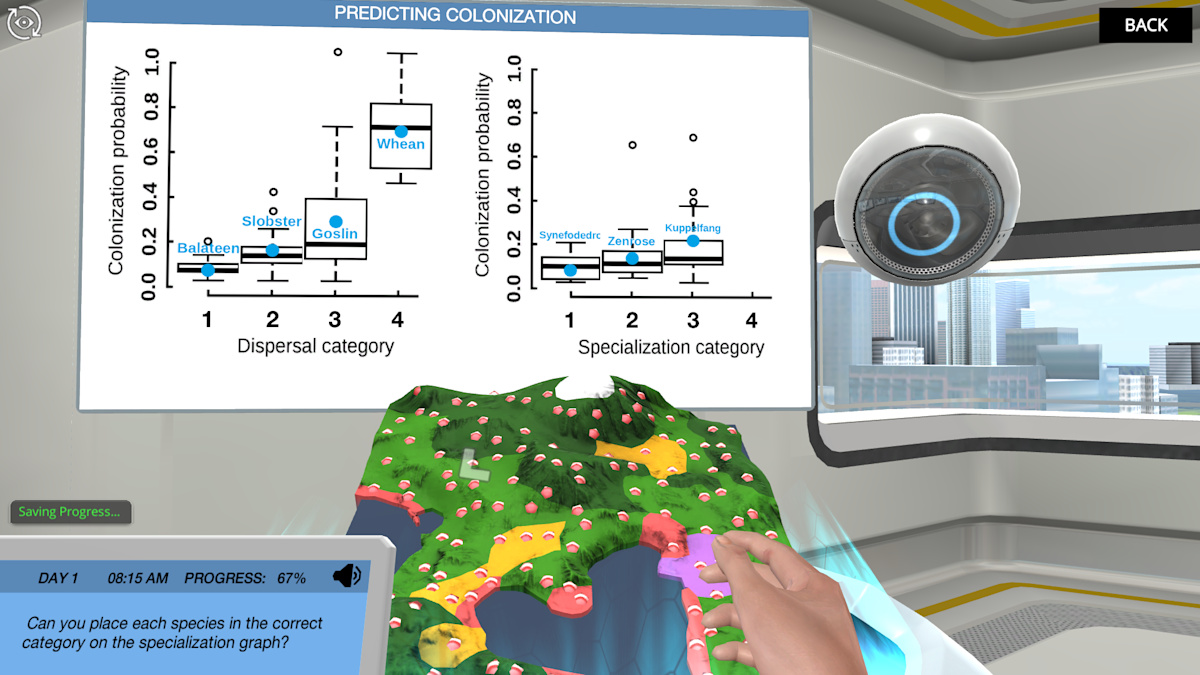 You will use a variety of methods to estimate both colonization and extinction rates, which you will use together to predict the Propella’s population dynamics. Firstly, you will be tasked with interpreting GIS maps to identify a variety of different landscape patch types and paint a full mosaic of the landscape. Using impressive data visualization techniques layered on an interactive 3D map, you will analyze dispersal capabilities and specialization levels of a variety of species to help predict the colonization probability of the Propella. Extinction rates will be analyzed using both Species-Area Relationship and Endemics-Area Relationship. Finally, you will combine all of the accumulated data and landscape ecology principles to summarize the impact of recent volcano eruptions and human growth on the Propella’s population.