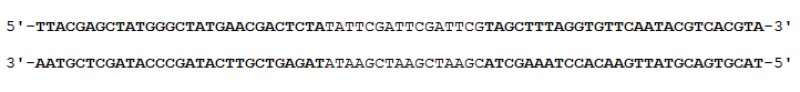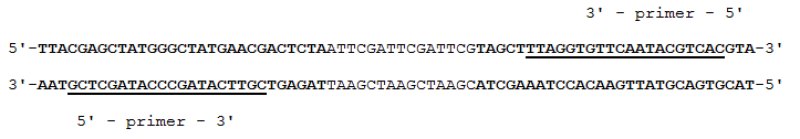 如果我们得到一个DNA片段,如下图所示,并且想要设计引物来在PCR反应中扩增整个区域,我们必须将引物放在序列的两端。引物区域如下粗体所示: