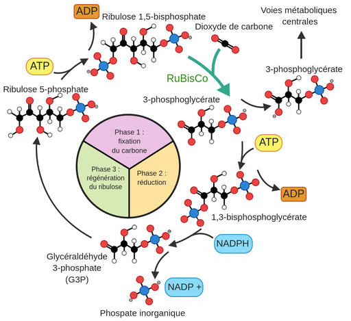 Comme le montre la figure ci-dessus, le cycle de Calvin produit du 3-phosphoglycérate, une molécule à trois carbones qui est ensuite utilisée comme précurseur du glucose et d'autres sucres dans d'autres voies métaboliques. Ces sucres sont utilisés comme source d'énergie pour les cellules et comme éléments constitutifs de nombreux autres composants cellulaires.