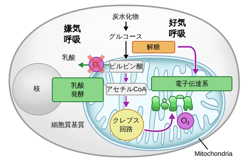 クレブス回路に加わり,電子伝達系の発生が可能になります。嫌気細胞呼吸では酸素は必要ではありません。ピルビン酸に乳酸発酵が行われ
