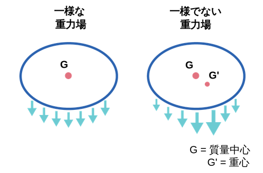 図2:均一及び不均一場における質量及び重心。