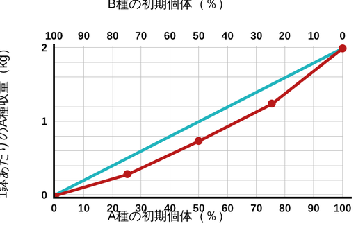 図1では、デ・ウィット系列グラフの典型的な例を見ることができます。上部にあなたが種Bの%を見つけることができ、Xは軸ながら下部にX軸あなたは、種Aの%を見つけることができ、及び時種Aの収率は、青い線が1でY軸: 1本のライン、およびそれがポイント内および種間競争を表し、等しい(すなわち、同じ量の種Bかく乱種Aの一つの個別の添加種Aの他の個々の添加という)です。赤い線は、データラインです。種間競争が種内競争よりも大きいことを意味して1:この場合、行が1を下回っています。我々は50%/ 50%のデータを見れば、我々が得られた収率は0.75キロの周りであることがわかりますポイント・メートル-2。その競争は約25%の収率で還元されることを意味し、ただし、無競争と予想収量は1キロ・M-2(同じ時点で1行1)です。