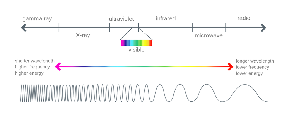 전자기스펙트럼모두(전자파)의연속이다(위키/전자기파동)및(주파수(위키/주파수)들은[파장(/위키파장)에따라배열。전자기스펙트럼을만들어전자파의종류전파,마이크로파,적외선,가시광선,자외선,X선및감마선이다。