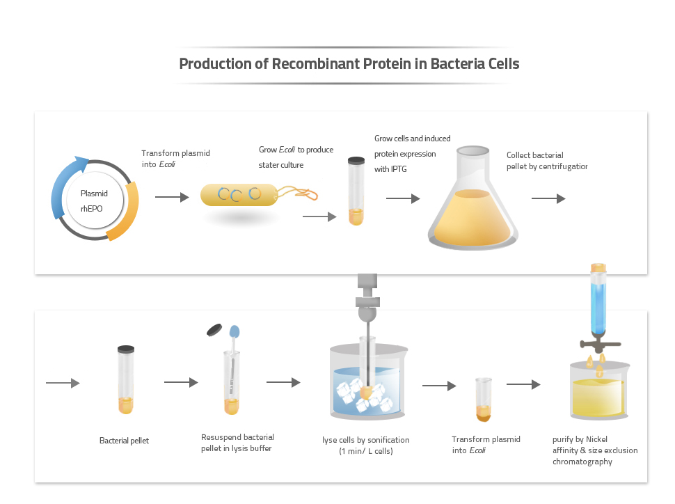 The first step of synthesizing recombinant proteins is to clone the DNA sequence that encodes the protein of interest into a vector (i.e. plasmid). The vector is then inserted into an expression system of choice. The expression system can be cells of bacteria, yeast, mold, mammals, plants or insects. Each expression system has its own advantages and disadvantages that determine protein quality, functionality, and yield. In this lab, we use two types of expression systems representing eukaryote cells (CHO cells) and prokaryote cells (Escherichia coli).