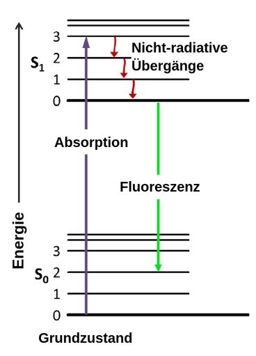 Abbildung 1: Jablonski-Diagramm der Fluoreszenz.Nachdem ein Elektron ein hochenergetisches Photon absorbiert hat, wird das System elektronisch und schwingungsmäßig angeregt. Das System entspannt sich schwingungsmäßig und fluoresziert schließlich mit einer längeren Wellenlänge.