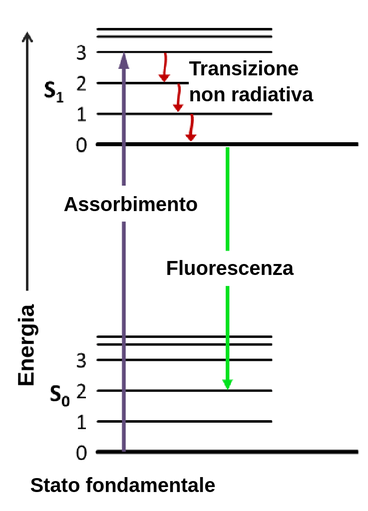 Figura 1。Diagramma迪Jablonski della fluorescenza.Dopo che un elettrone assorbe un fotone di alta energia, il sistema è eccitato elettronicamente e vibrazionalmente. Il sistema si rilassa vibrazionalmente e, alla fine, diventa fluorescente a una lunghezza d'onda maggiore.