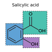 図1サリチル酸の官能基。紫=フェノール。緑=カルボン酸。青=フェニル。