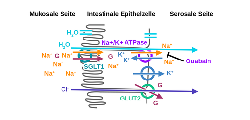 Die Epithelzellen des Darms bilden die Schnittstelle zwischen dem Darmlumen (mukosale Seite) und dem Blut (serosale Seite) und verfügen über viele verschiedene Rezeptoren und Kanäle, die den Fluss verschiedener Moleküle in beide Richtungen ermöglichen.