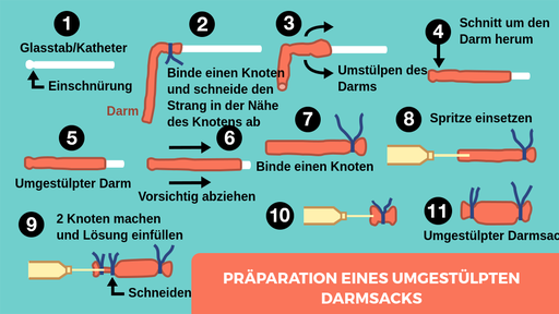 Umgestülpte Darmsäcke können zur Untersuchung des Glucosetransports durch das Darmepithel verwendet werden. Der Darm wird von innen nach außen gedreht, um sicherzustellen, dass der gesamte Darminhalt entfernt wird, damit er die Ergebnisse nicht beeinträchtigt.