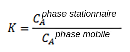 Il existe un équilibre entre l'analyte et les deux phases. Plus l'analyte interagit avec la phase stationnaire, plus il restera dans la colonne. S'il interagit davantage avec la phase mobile, il restera moins longtemps dans la colonne. Le coefficient de partage (K) est utilisé pour mettre en relation la concentration de la substance à analyser dans chacune des deux phases, comme indiqué ci-dessous :