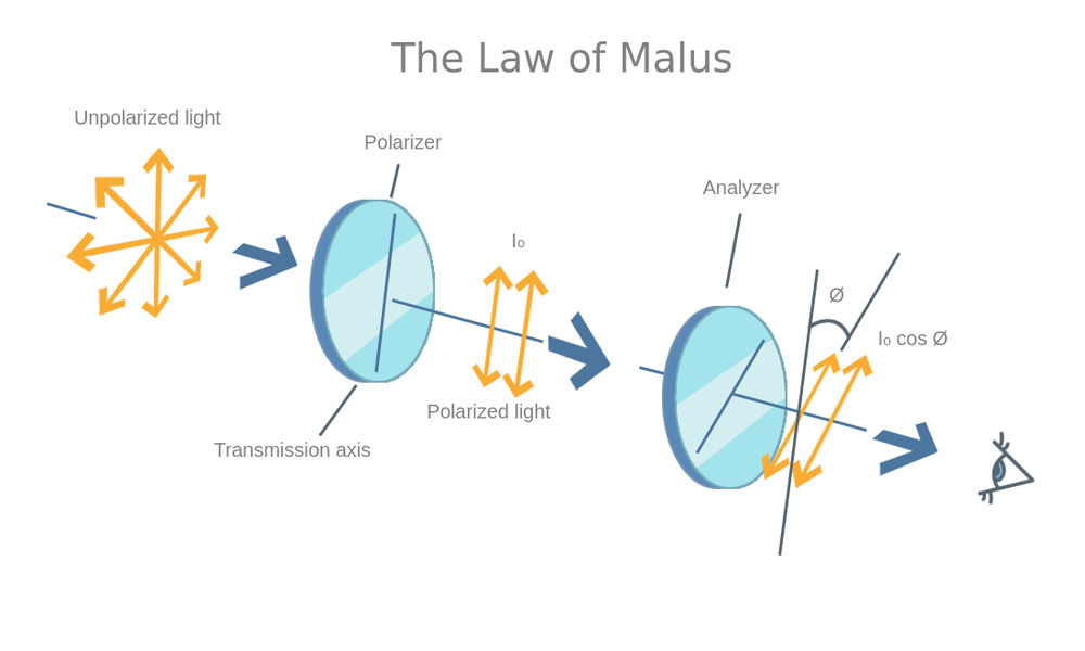 直線偏光のために,私は~ 0 ~,強度が理想偏光子を透過した強度で,我は,θは偏線形入射偏光軸の間の角度であるマリュスの法則によって説明することができます。