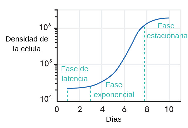 El crecimiento de las células en cultivo consta de 3 fases: lafase de latencia, en que las células se acostumbran al nuevo medio tras la siembra; lafase exponencial,在中和proliferan exponencialmente y, finalmente, lafase estacionaria, en que la proliferación celular se reduce considerablemente o cesa por completo debido a necesidades de espacio o a la falta de nutrientes.