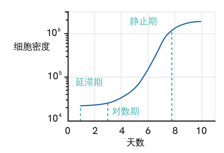 细胞生命分为3个阶段:延滞,细胞接种后开放适应新环境;是对数期,此时细胞呈呈型型;最后是静止,由于空间需要或营养,细胞增殖速度大大降低甚至完全停止。