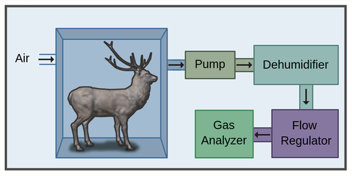 代谢室是研究动物代谢功能的密闭空间。干燥的空气通过泵和流量调节器以设定和测量的速率通过腔室,通过除湿器柱去除水分和二氧化碳,然后送到氧气分析仪。在这些条件下,氧气消耗可以准确地测量氧气在进水和出水空气中的比例。