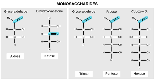 単糖類(モノ=“1”,sacchar =“甘い”)は単糖です。単糖類では,炭素原子の数は通常3から7の範囲です。ほとんどの単糖名は“- ose”