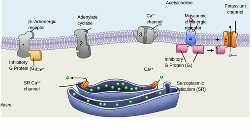 ACh binds to muscarinic receptors (M2) that are found principally on cells comprising the sinoatrial (SA) and atrioventricular (AV) nodes.