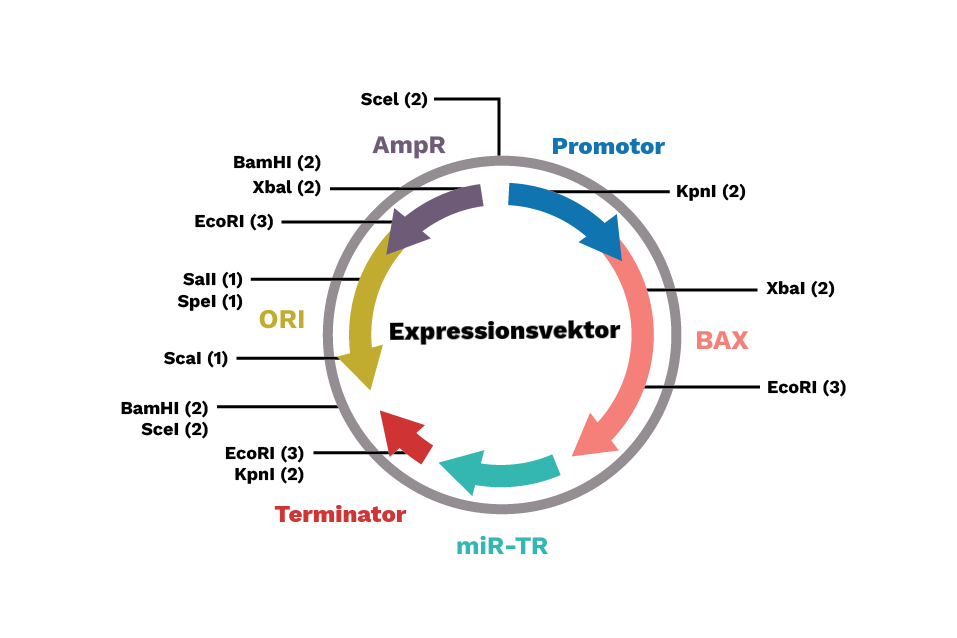 Plasmide我是häufigsten verwendetenVektoren.dna序列的位置,这个位置是复制序列(ORI),抗生素序列(AmpR),启动子和终止子,以及质粒所在的位置Vektorkartendargestellt。
