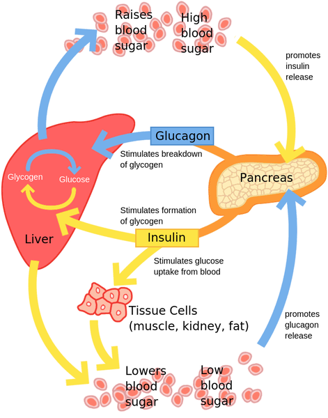 영양 섭취를 관리하기 위해 신체는 에너지 저장을 완화하기 위해 호르몬을 사용합니다. [췌장]은 혈당치를 조절하는 글루카곤 (위키 : / 췌장) 셀은 두 호르몬 제인슐린를 생성한다. 이 두 호르몬은 항상성 포도당 수준을 유지한다.