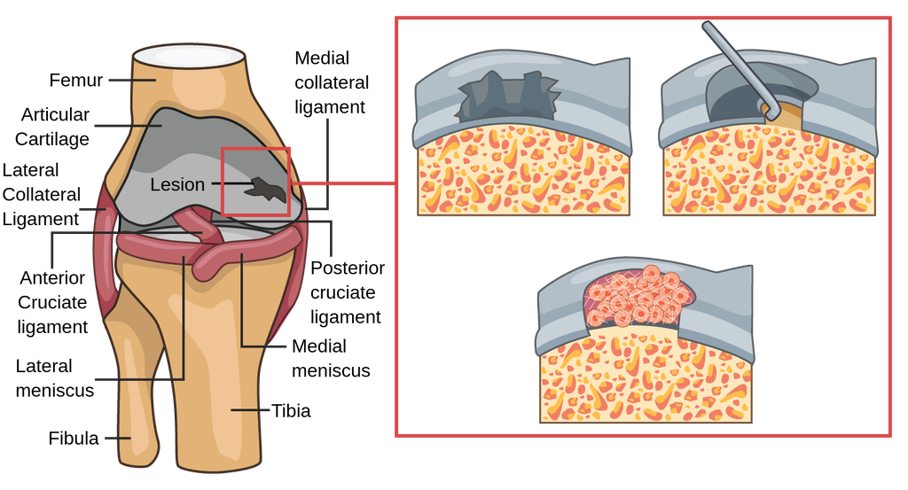 图1:关节软骨损伤的组织工程方案。A:局灶性关节软骨损伤。B:清除病灶以确保植入物的健康周边。C:用生物材料支架填充病变,触发组织更新。