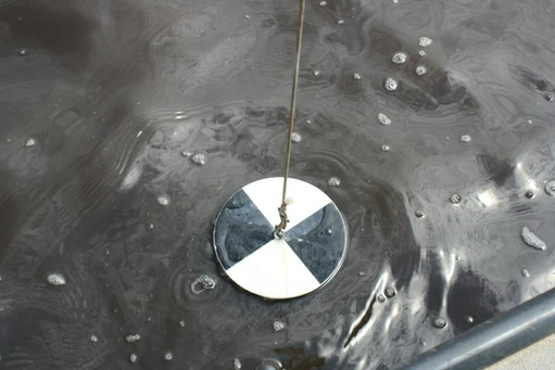 2. Lower the secchi disc into the water with the rope until the black and white sections become invisible.