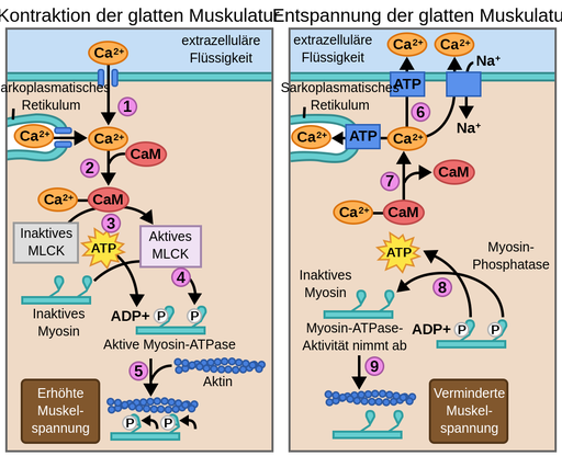 Die wichtigste Voraussetzung für die Kontraktion einer glatten Muskelzelle ist die Erhöhung ihrer intrazellulären Kalziumkonzentration, die eine Reihe von Ereignissen auslöst, die in Abbildung 1 dargestellt sind. Dieser Anstieg erfolgt typischerweise nach dem Eintreffen einesAktionspotentialsvon einem Motoneuron. Im Fall derglatten Muskulatur im Magen-Darm-Trakt直布罗陀海峡t es noch eine weitere Komponente: denPlexus myentericus.