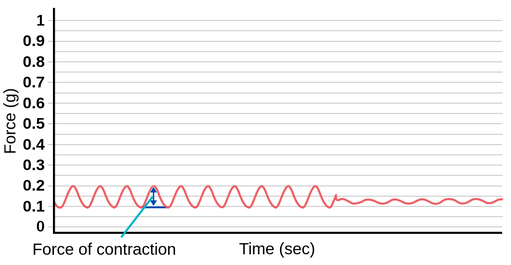 While the force transducer is collecting the force from the sample, the software plots a graph on the computer that represents the contraction/relaxation over time, drawing a line with some similarities to a sinus wave where the peaks are the contractions and the valleys the relaxation (Figure 1). Force, in grams, is stated on the Y-axis, while time, in seconds, is on the X-axis. The distance between the peak and the valley is the force of contraction, while the amount of peaks per unit of time is the frequency of contraction.