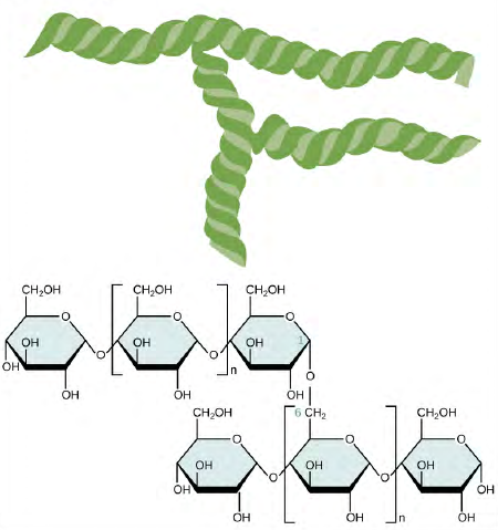 Figur 2:Amylopektin er sammensat af -forgreendekæderafglykosemonomerer forbundetMedα1,4ogα1,6glykosidbindinger。Glykogen(Ikke Vist)Minder Om amylopektin i Storuktur,纯粹是forgrenet。