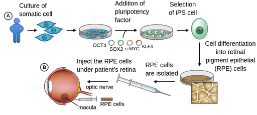 图 1。用iPS细胞治疗视网膜疾病。* *通过添加多能性因子(A)将体细胞培养并重新编程为iPS细胞。一旦这些细胞分化为 RPE 细胞,它们将被测试并注射到患者的视网膜下 (B)。