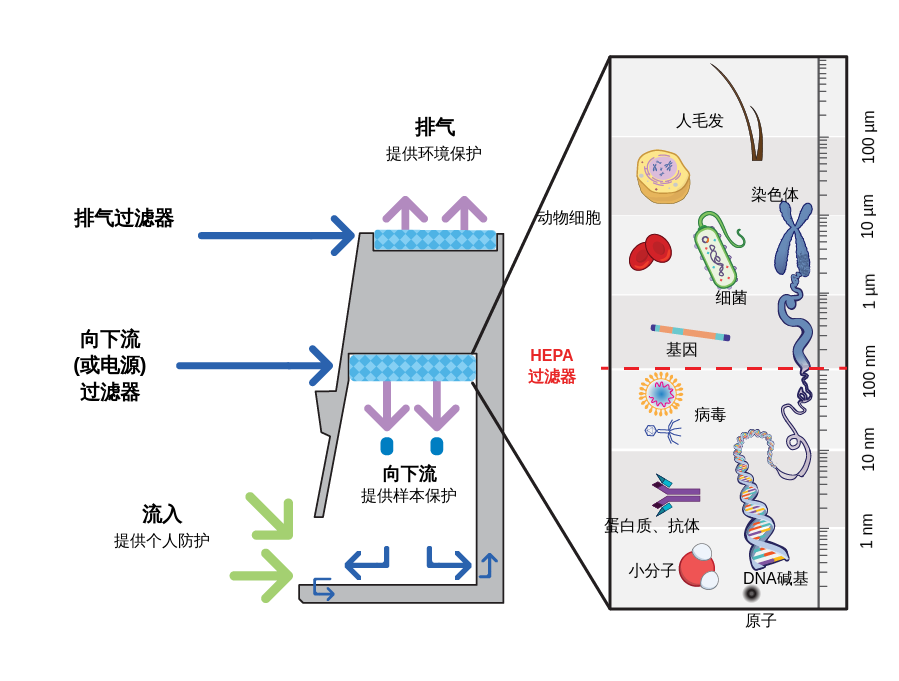 图1:细胞培养通风橱中的气流示意图 (左),包括HEPA过滤的颗粒 (右)。