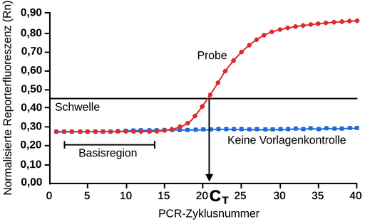 Der Zyklus, bei dem die Fluoreszenz einen bestimmten Schwellenwert überschreitet, wird als Ct-Wert bezeichnet (auch Cq für Quantifizierungszyklus genannt). Ein niedriger Ct-Wert deutet auf eine große Menge an Ausgangstranskript hin, da nur wenige Zyklen erforderlich waren, um die Fluoreszenzschwelle zu erreichen, und somit auf eine hohe Expression des untersuchten Gens. Ein hoher Ct-Wert deutet auf eine geringe Menge an Ausgangstranskript hin, da eine hohe Anzahl von Amplifikationszyklen erforderlich war, um die Fluoreszenzschwelle zu erreichen, und somit auf eine geringe Expression des Gens.