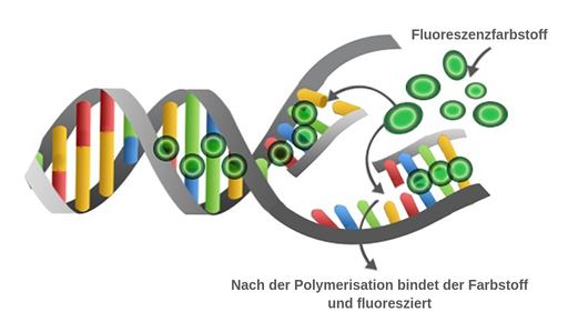 Während desqPCR-Experiments wird die Ziel-DNA genau wie bei einer normalenPCR-Reaktionwiederholt kopiert. Das SYBR-Green in der Mischung bindet an die doppelsträngigen DNA-Moleküle und macht sie fluoreszierend. Am Ende eines jeden Verlängerungsschritts wird ein Foto gemacht und die Stärke der Fluoreszenz quantifiziert.