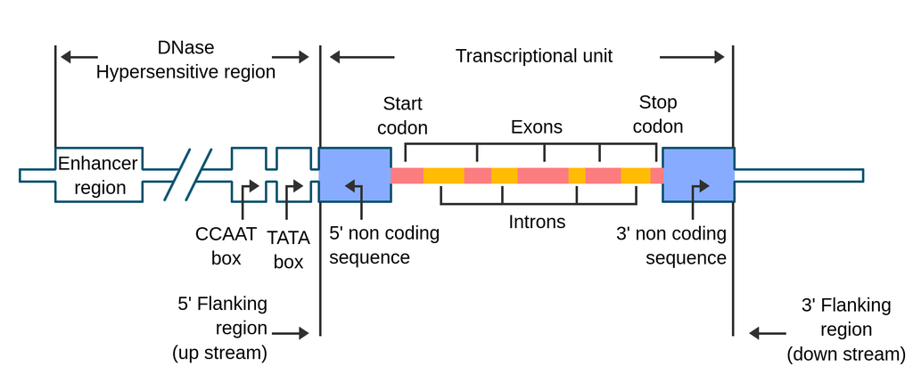 转录是利用 DNA 中的信息合成 RNA。真核生物基因由以下几部分组成: