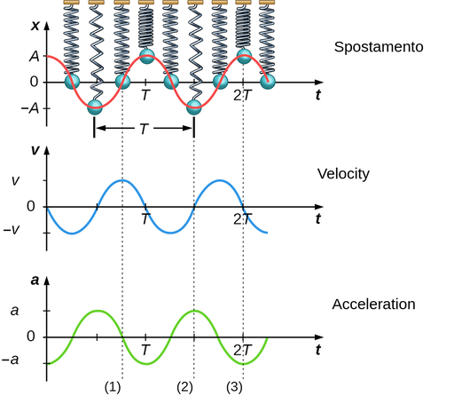 Per una massa che oscilla su una molla verticale secondo ilmoto armonico单纯的, lo spostamento in funzione del tempo è una funzione sinusoidale. Di conseguenza, anche la velocità e l'accelerazione cambiano in modo sinusoidale. La figura 1 mostra la componente verticale (e unica) di spostamento, x(t), velocità, v(t) e accelerazione, a(t) per una massa inizialmente spostata a una distanza A dalla suaposizione di equilibrio(qui impostata come x=0).