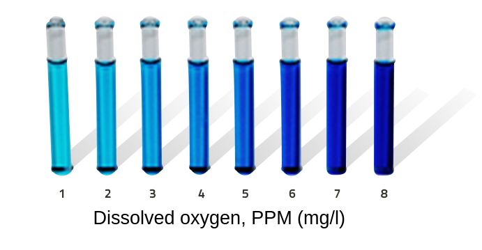 본실험에서는물시료중의용존산소농도를측정하는방법을사용하여비색。용존산소테스트분류기는인디고카민을。산성용액에서산소밝은색깔청색염료를형성인디고카민의황록색류코형태로산화시킨다。상기물샘플에서의산소농도를용해얻어진청색비례한다。