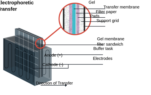 El gel de poliacrilamida es un material perfecto para separar proteínas, pero no vale para detectar anticuerpos. Por ello, hay que transferir las proteínas que están en poliacrilamida a una membrana de soporte sólido (normalmente hecha de nitrocelulosa o difluoruro de polivinilideno, PVDF). La transferencia de proteínas a una membrana usa un campo eléctrico que es perpendicular a la superficie del gel.