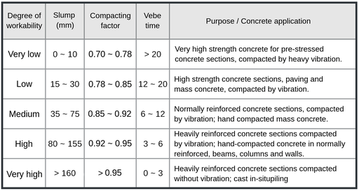 에서 [신선한 콘크리트] 가공성 (위키 / 혼합 콘크리트)를 적절하게 압축 이송 넣고 충분히 분리없이 쉽게 완료 될 콘크리트의 특성으로 정의 될 수있다. 가공성의 주요 특징은 일관성 (또는 유동성) 및 응집성이다. 일관성 신선한 콘크리트의 흐름의 용이성을 측정하는 데 사용됩니다. 그리고 응집력은 분리와 과도한 출혈없이 함께 모든 재료를 보유하는 신선한 콘크리트의 능력을 설명하는 데 사용됩니다. 성에 영향을 미치는 요인은, 수분 함량, 골재 혼합 비율, 최대 골재 크기, 집계 특성, 시멘트, 혼화제 및 주위 온도와 시간을 포함한다. 일반적으로 사용되는 종래의 시험 방법은 1)슬럼프 시험, 2) 요소의 압축 시험 3) Vebe 시험.