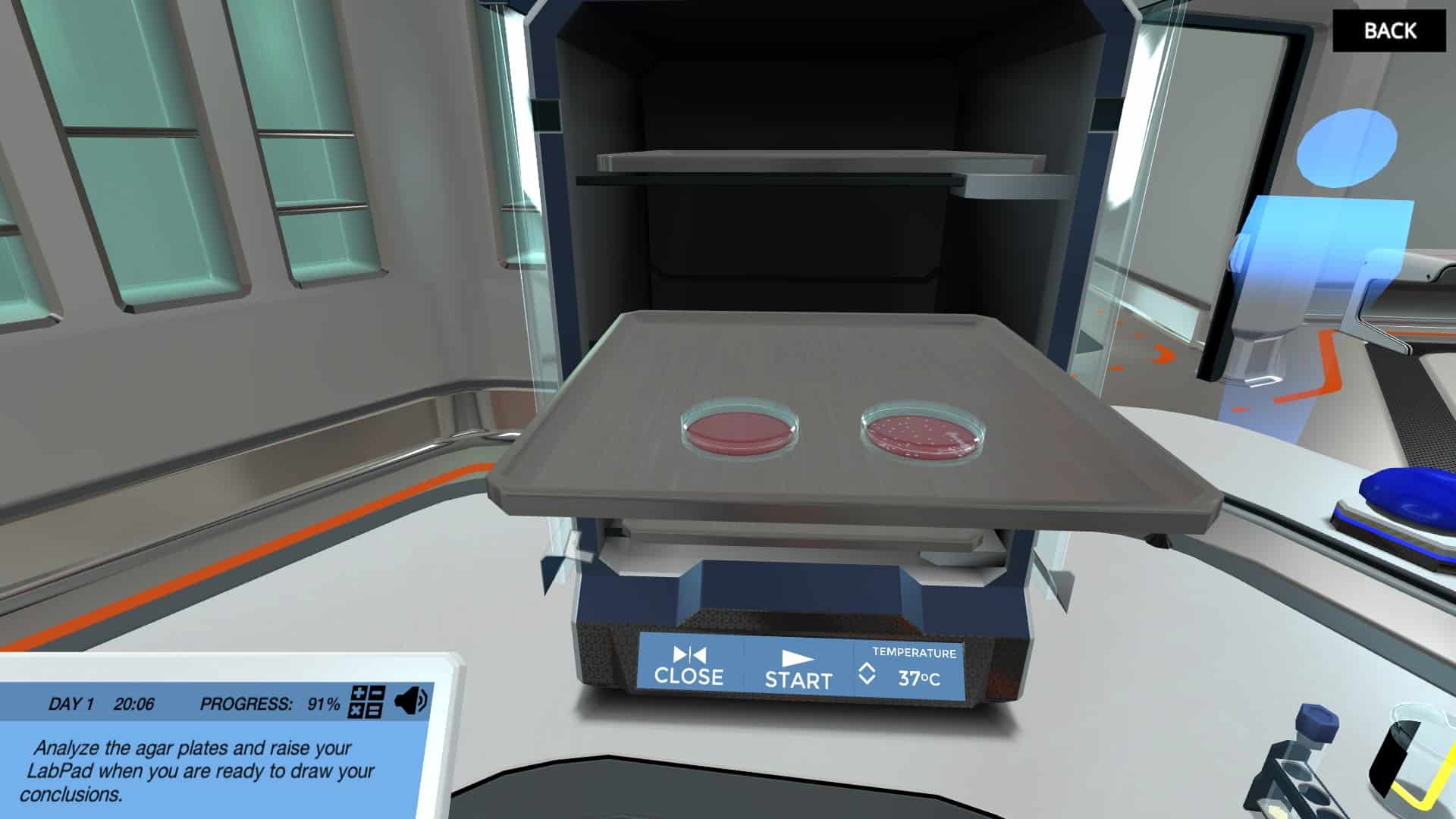 接下来,你要用无菌设备和试剂培养你的样品和适当的控制。一旦你把你的样品放入培养箱:现在是清理时间!如果你不小心污染了其中一个样本或者不小心把实验室点着了,一号博士会再次指导你。