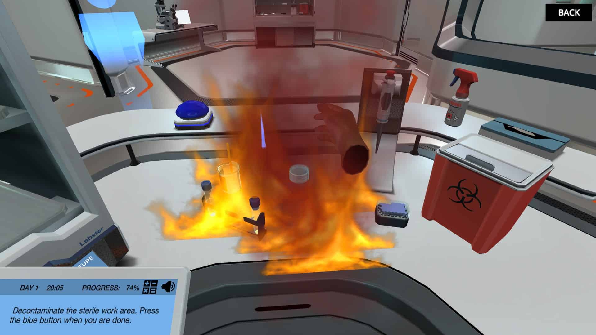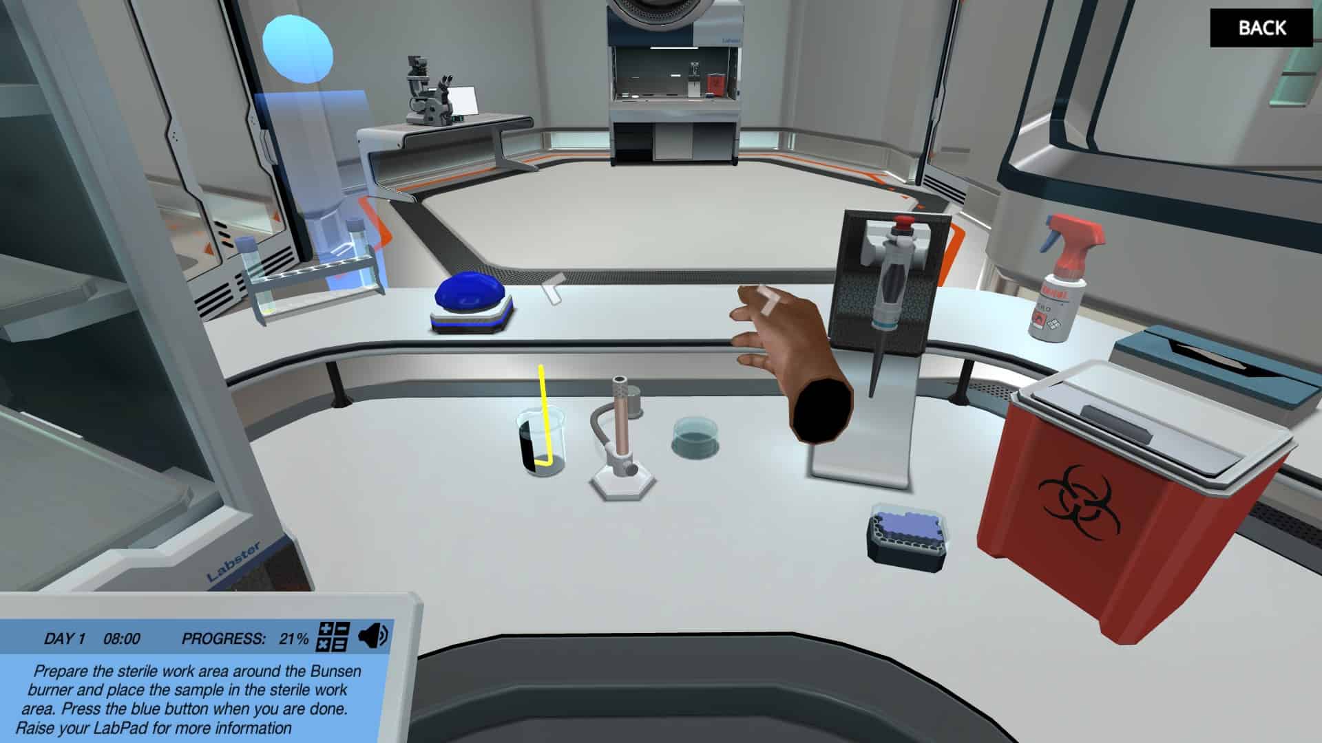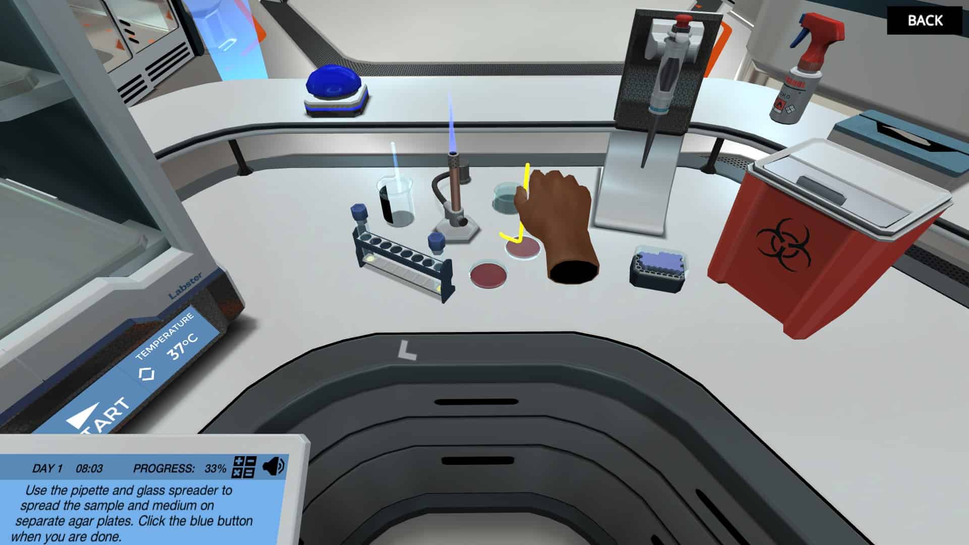 你将从准备无菌工作区开始。使用您自己的微生物学知识,工具提示和理论页面,以确保您正在使用良好的无菌技术。如果你犯了一个错误,你的工作区域不是很枯燥,不要担心。在虚拟实验室中,Dr. One可以指导你重复一些步骤,而不会像在物理实验室中那样浪费几个小时。