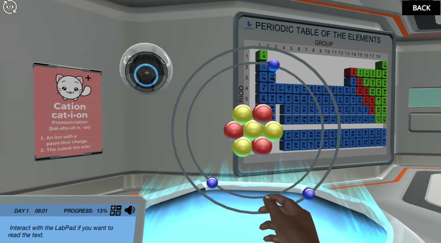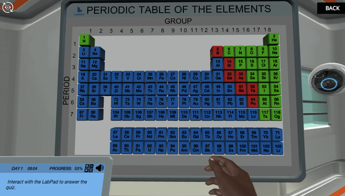 As a part of your mission, you will be teleported to an exoplanet to explore on your own, collect samples and come up with observations regarding the presence of life on the planet. Back in the laboratory, you will investigate the properties of the elements you brought back from the exoplanet. The periodic table will be close by to advise and guide you.