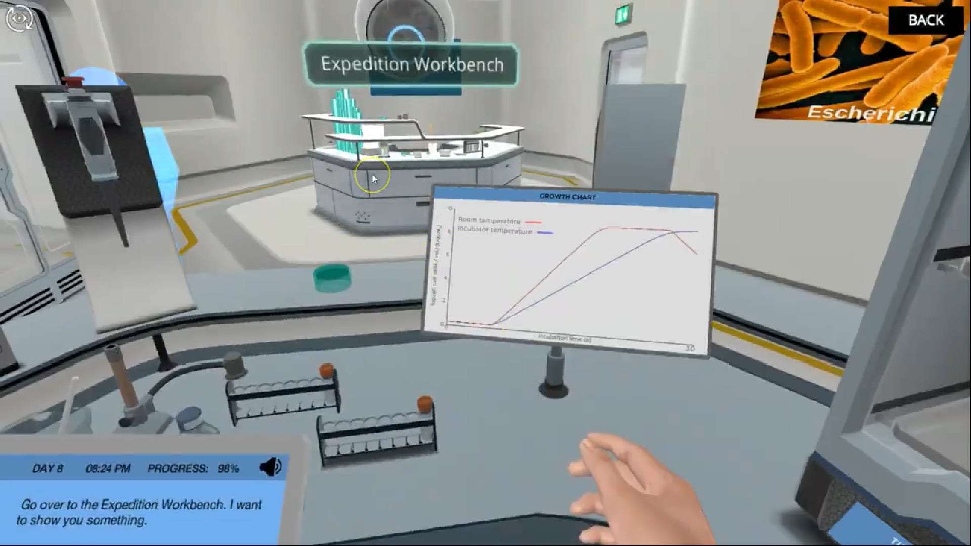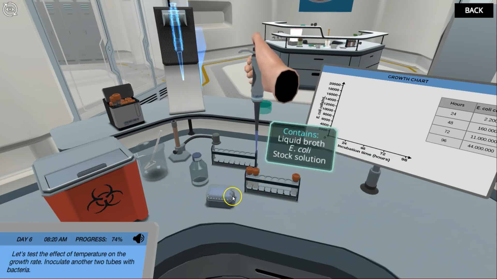 您的第一任务是使用真菌化合物生长大肠杆菌并绘制细菌生长。您的工作是确定细菌生长的不同阶段。该模拟允许您自由实验并建立自己的实验,以确定温度对细菌生长的影响。