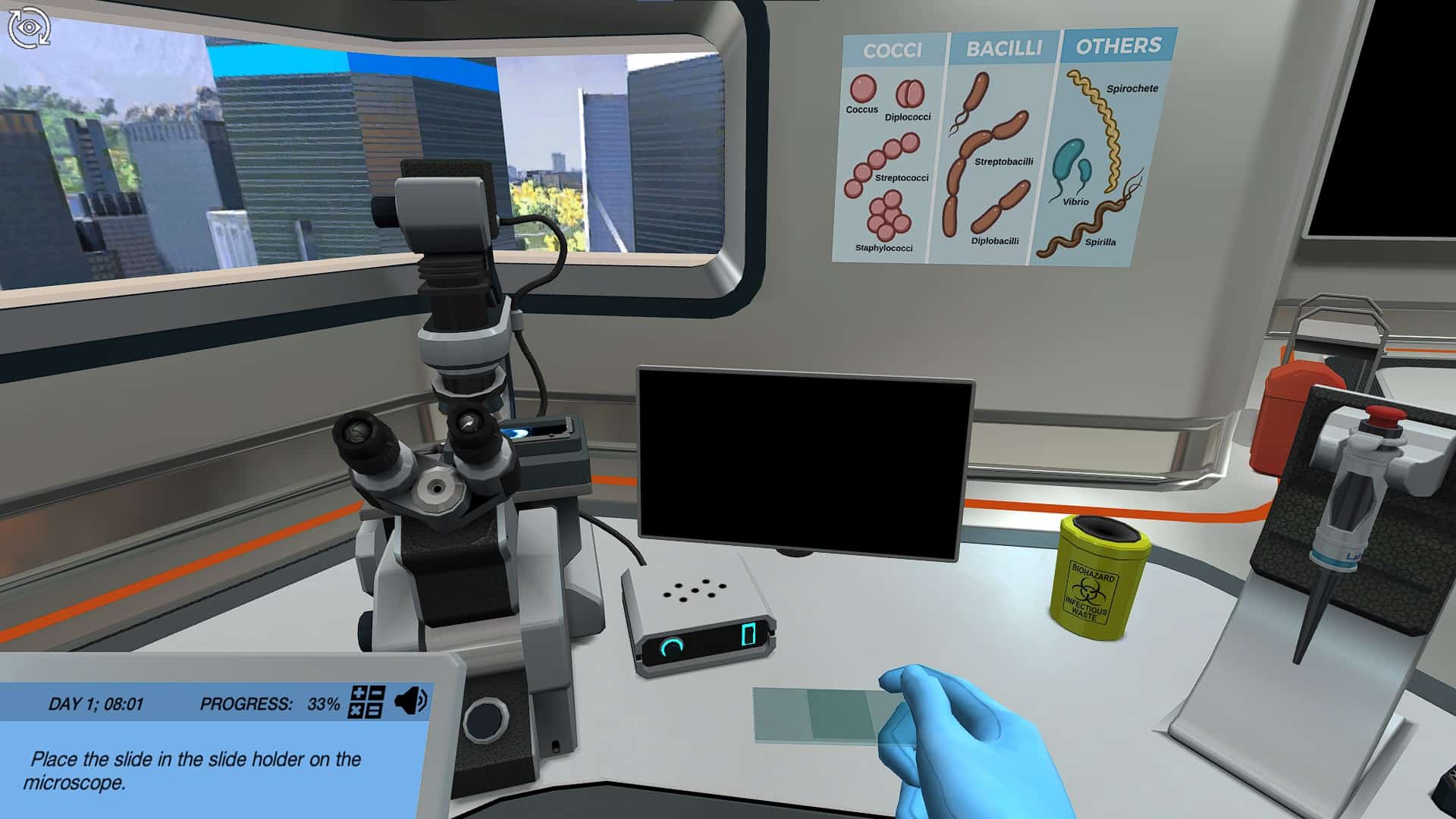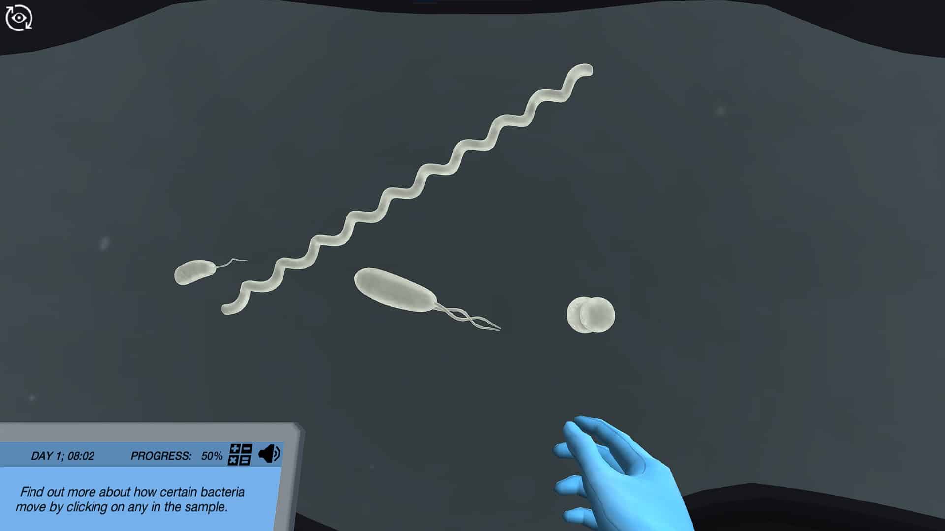 小心地放置显微镜滑梯后,您将看到不同类型的细菌在屏幕上移动。在更详细地查看细菌之前,您需要为显微镜选择设置。比较显微镜Brightfield和Darkfield模式,然后选择您认为最适合清除细菌的最佳选择。然后准备深入研究这个微观环境。