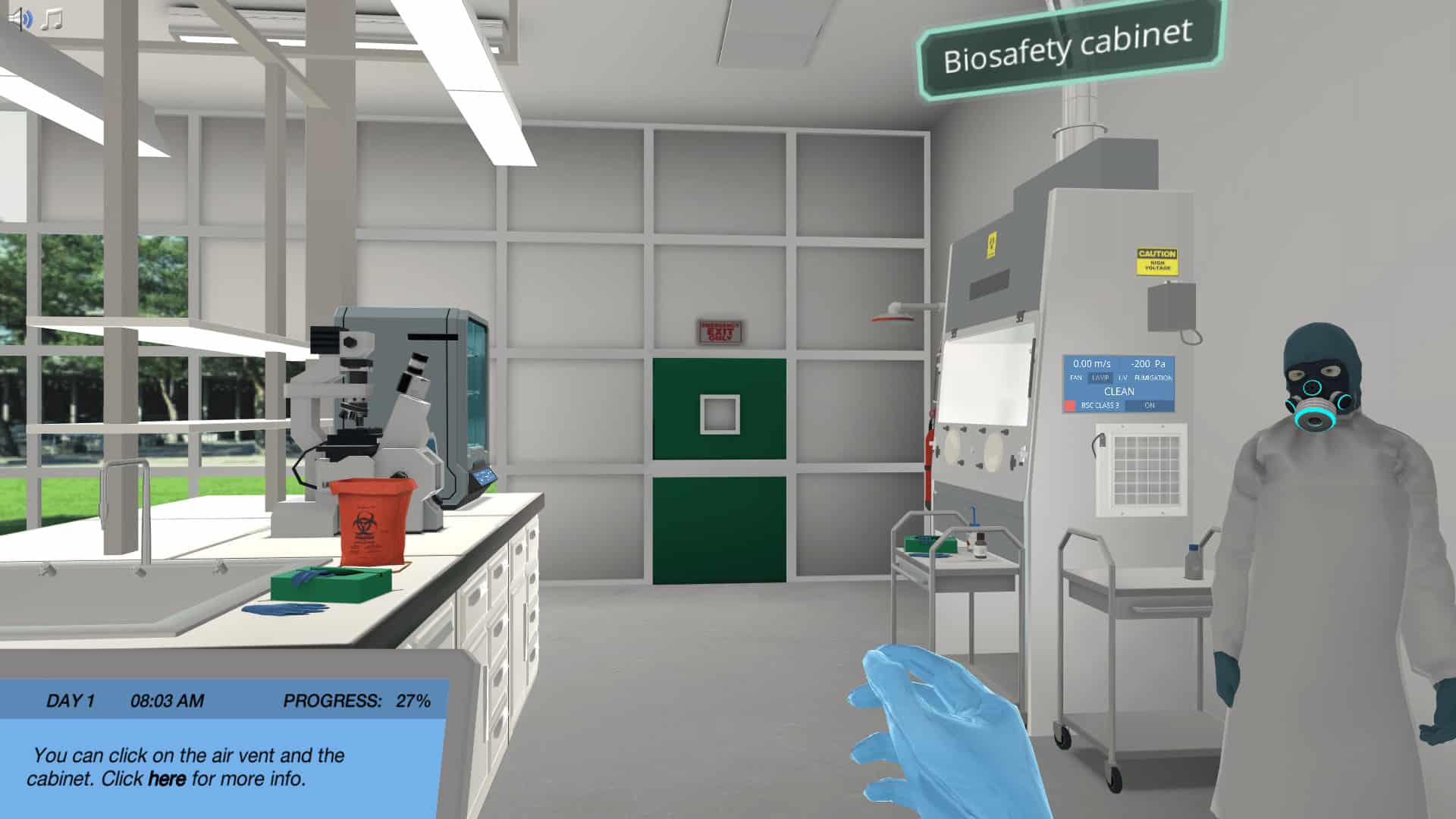 在此上下文中的遏制是指各种机构安全地安全地操纵这些病原体的要求。在此模拟中,您将能够体验到遏制级别3(生物安全等级3或BSL3)研究实验室。
