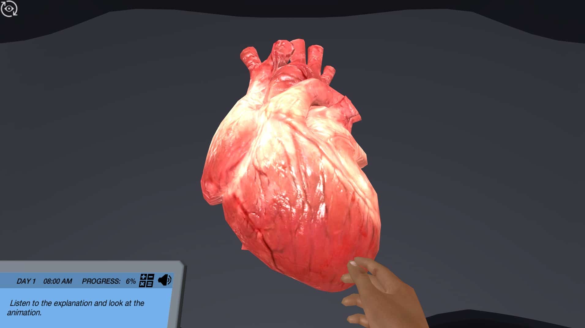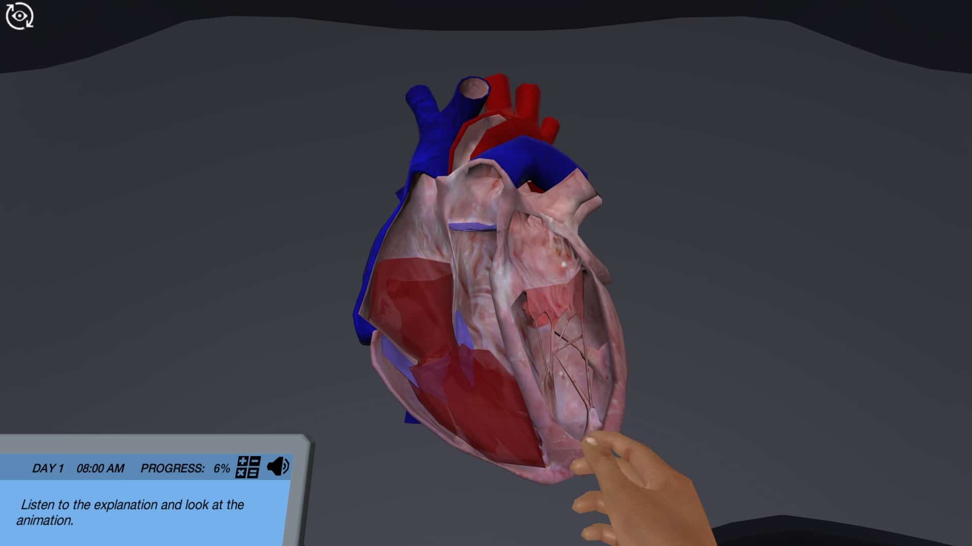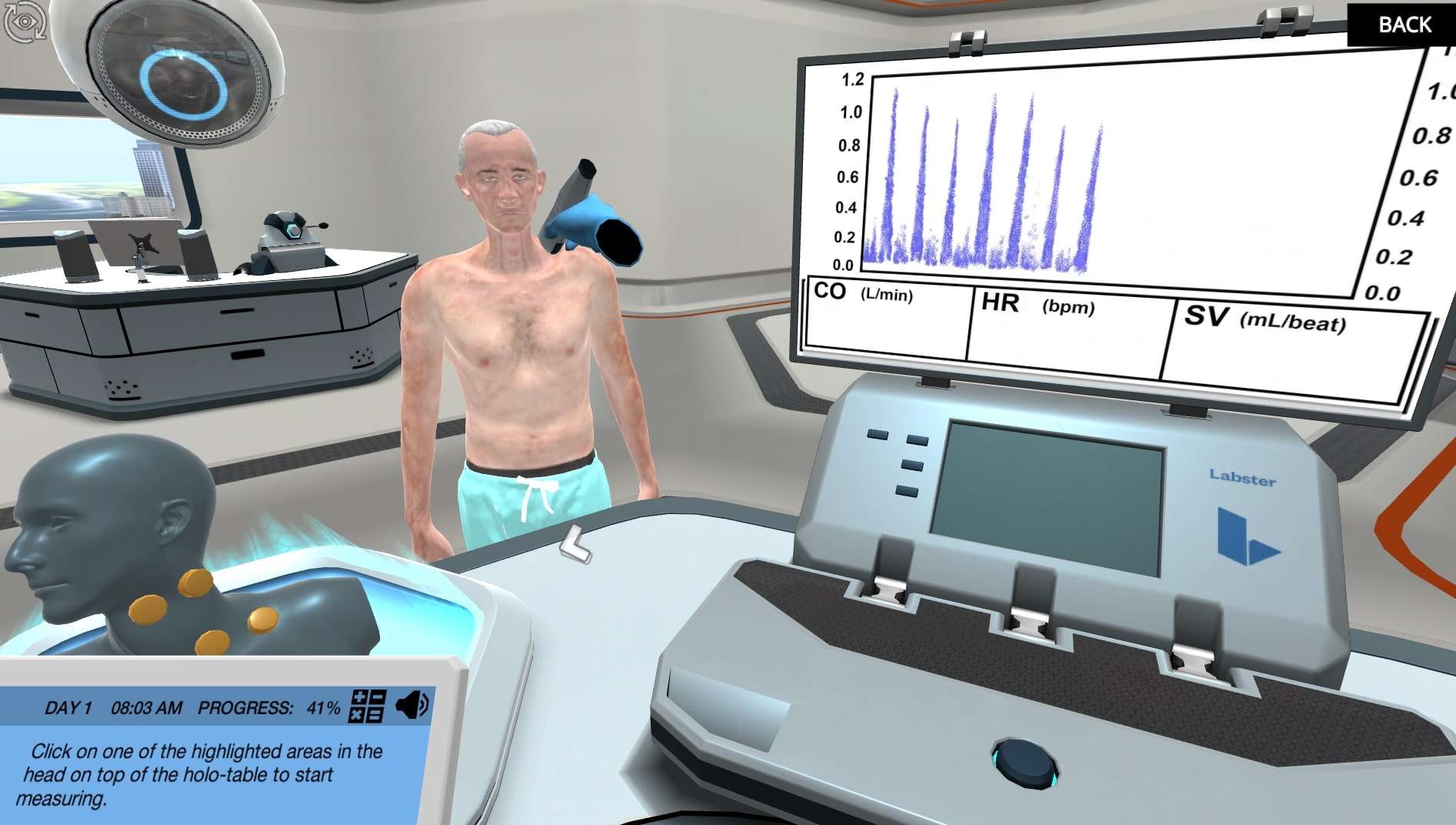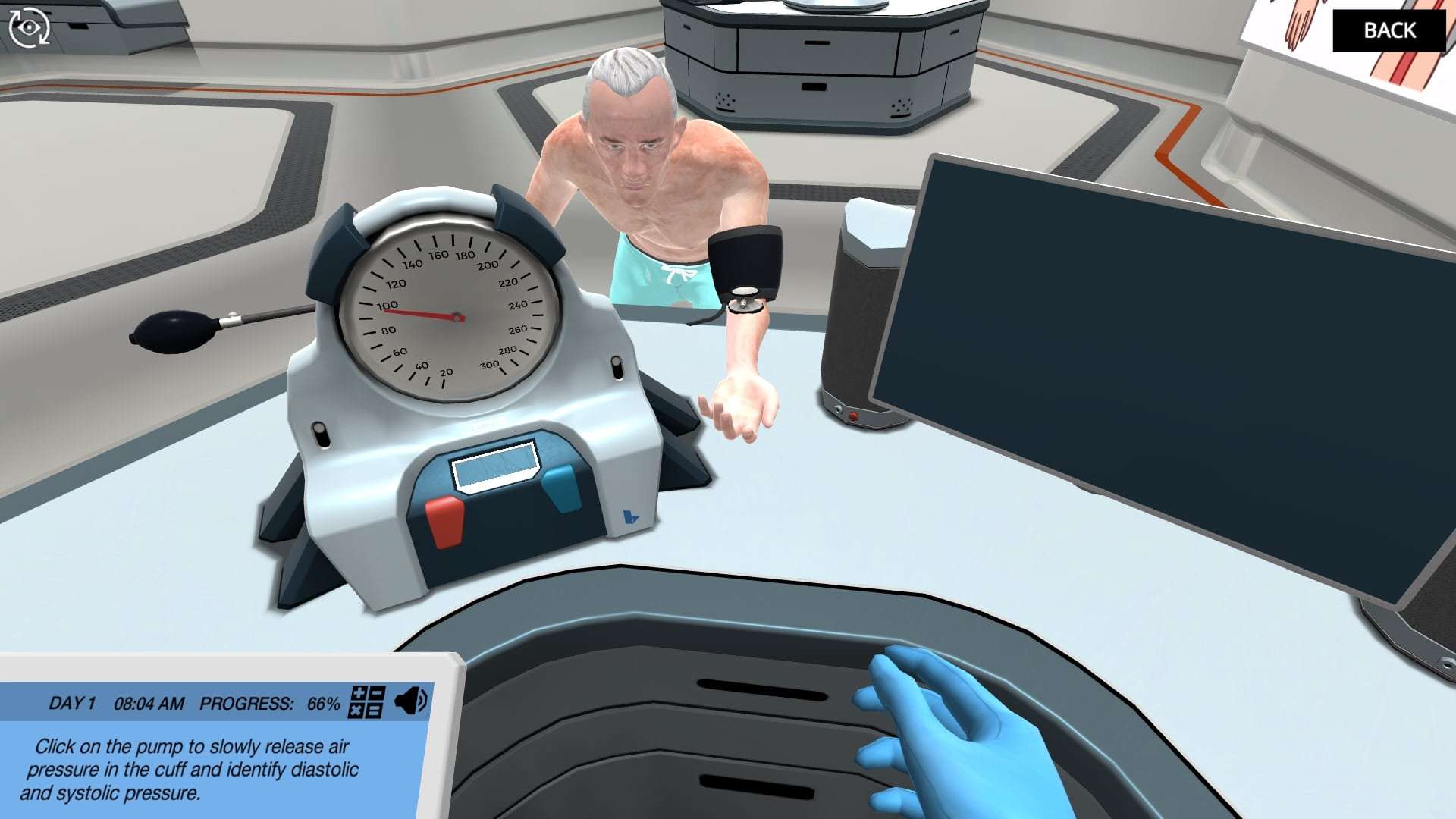 In the simulation, you will measure the blood pressure of your study subject, like you would in real life. You will also determine systolic and diastolic blood pressure by using a sphygmomanometer. You can listen to the blood flowing through the arteries with the stethoscope as many times as you want, until you find the study subject’s blood pressure. You will also be able to measure heart rate, stroke volume and cardiac output thanks to the advanced doppler ultrasound machine.