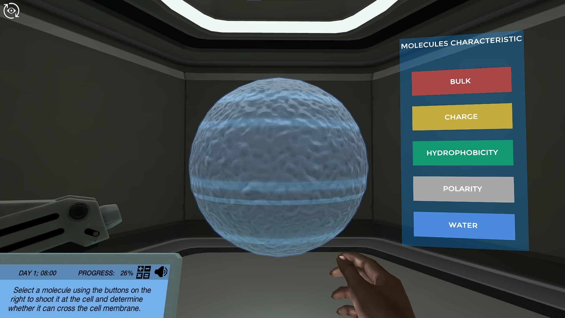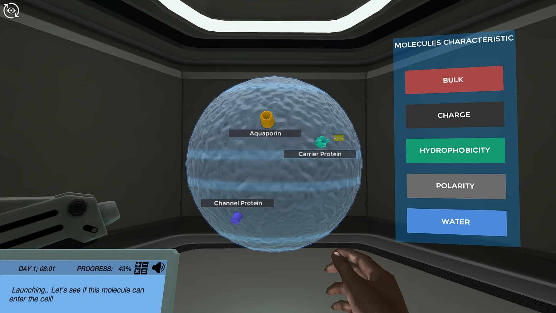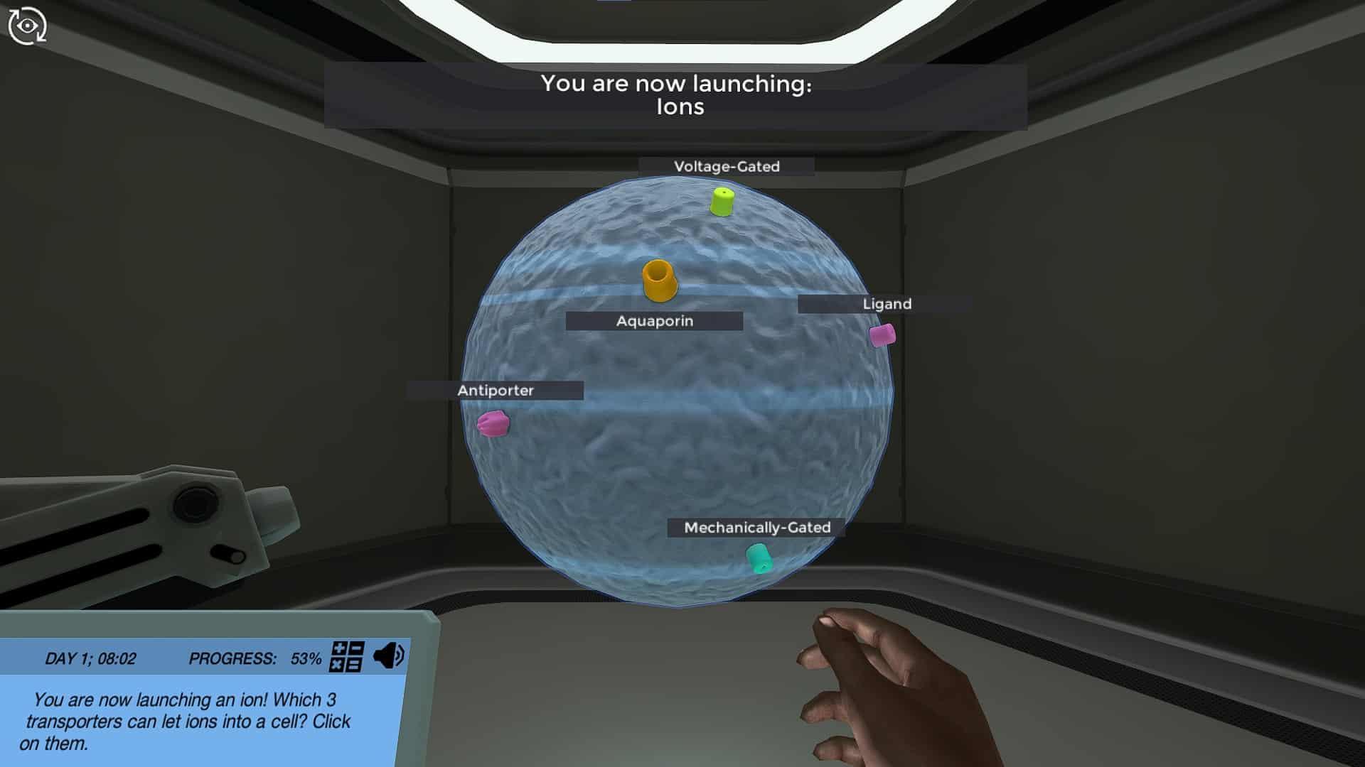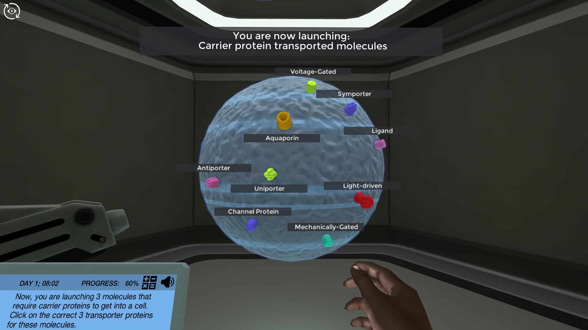 您的使命开始通过在虚拟单元中发射分子来发现哪些分子可以单独穿过细胞膜,并且哪些分子需要转运蛋白。您将学习每种主要类型的转运蛋白类型的作用:水素,载体蛋白和通道蛋白。