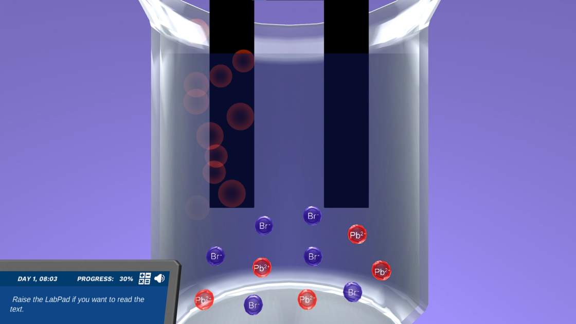 In order for you to modify the electrolytic cell you built, you need to find out how electrolysis works. Dive into an interactive animation, where you will learn the function of the electrolytic cell components, and discover the chemical reactions that occur at each electrode. Return to the Mars lab, where you will test and apply your electrolysis knowledge.