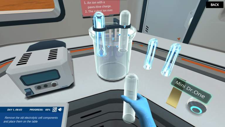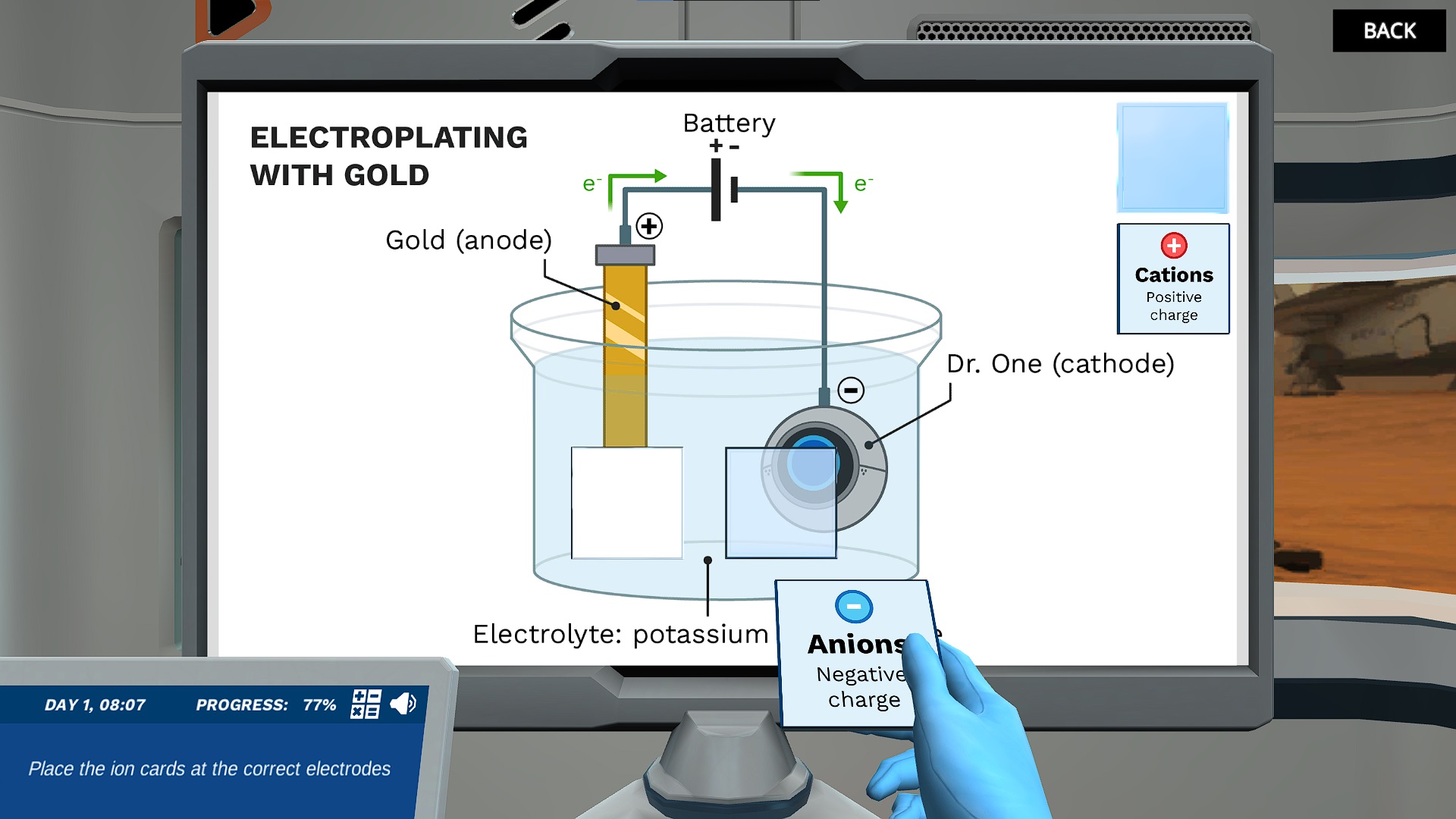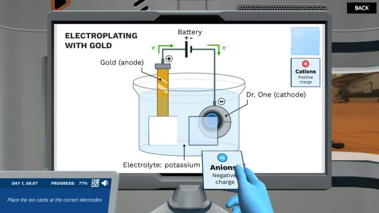 Experiment with the components available to build two different electrolytic cells: one that makes hydrogen fuel, and another that can coat mini Dr. One in gold. Test your knowledge of each component by interacting with a schematic of an electrolytic cell. Can you get the rover and mini Dr. One ready to explore Mars?