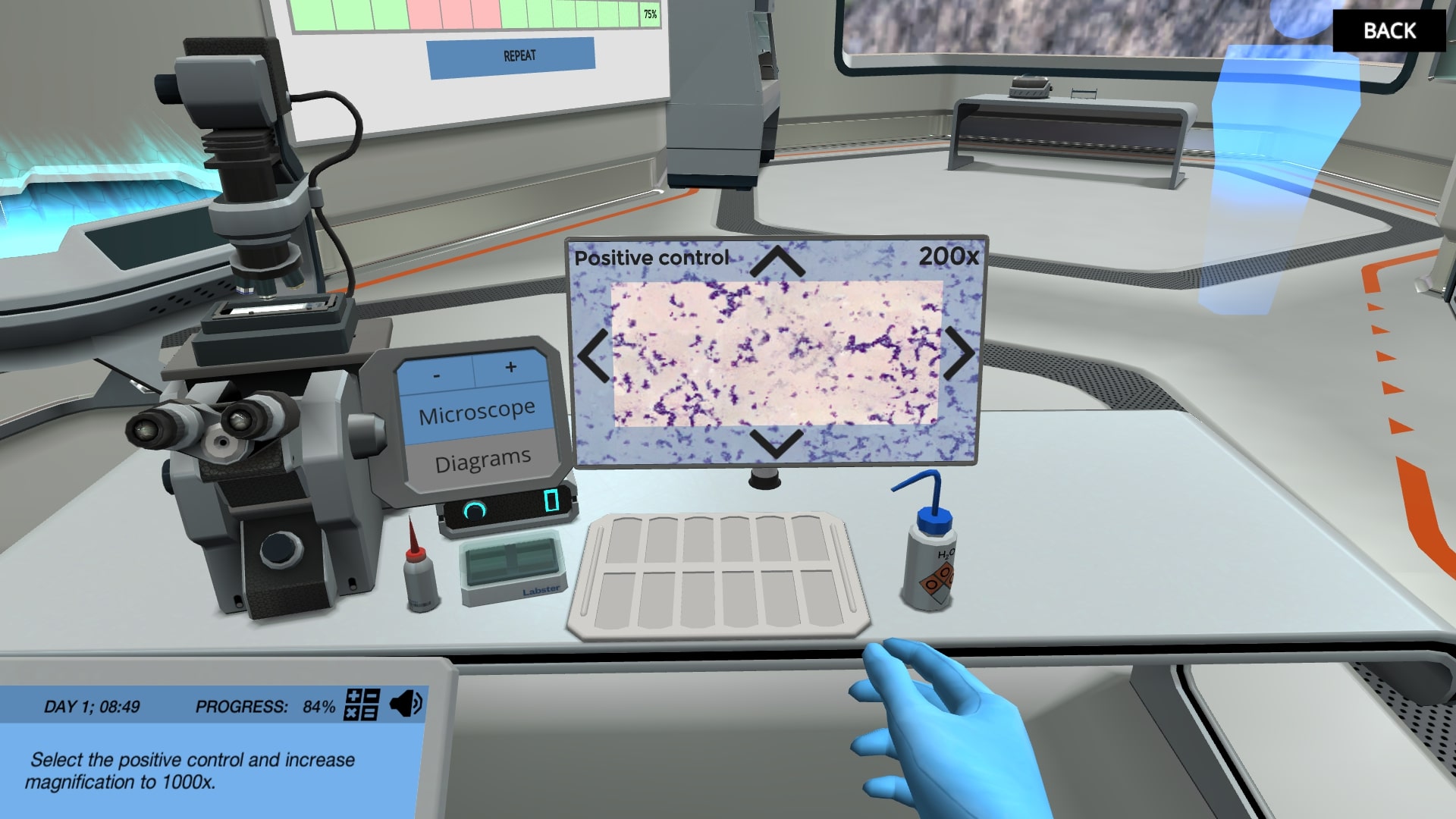 Being able to tell the difference, you will use a light microscope to interpret the results of a given Gram stain. View the microscopic image on the computer screen, and remember to apply immersion oil to increase magnification! Will you be able to identify the presence of bacteria?