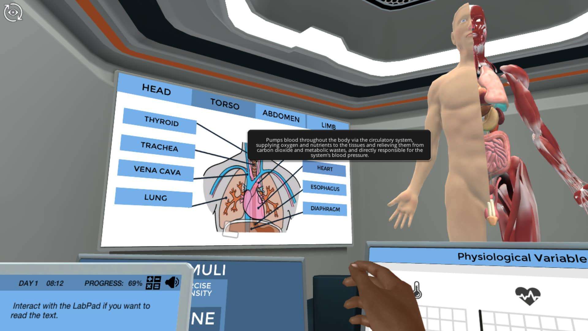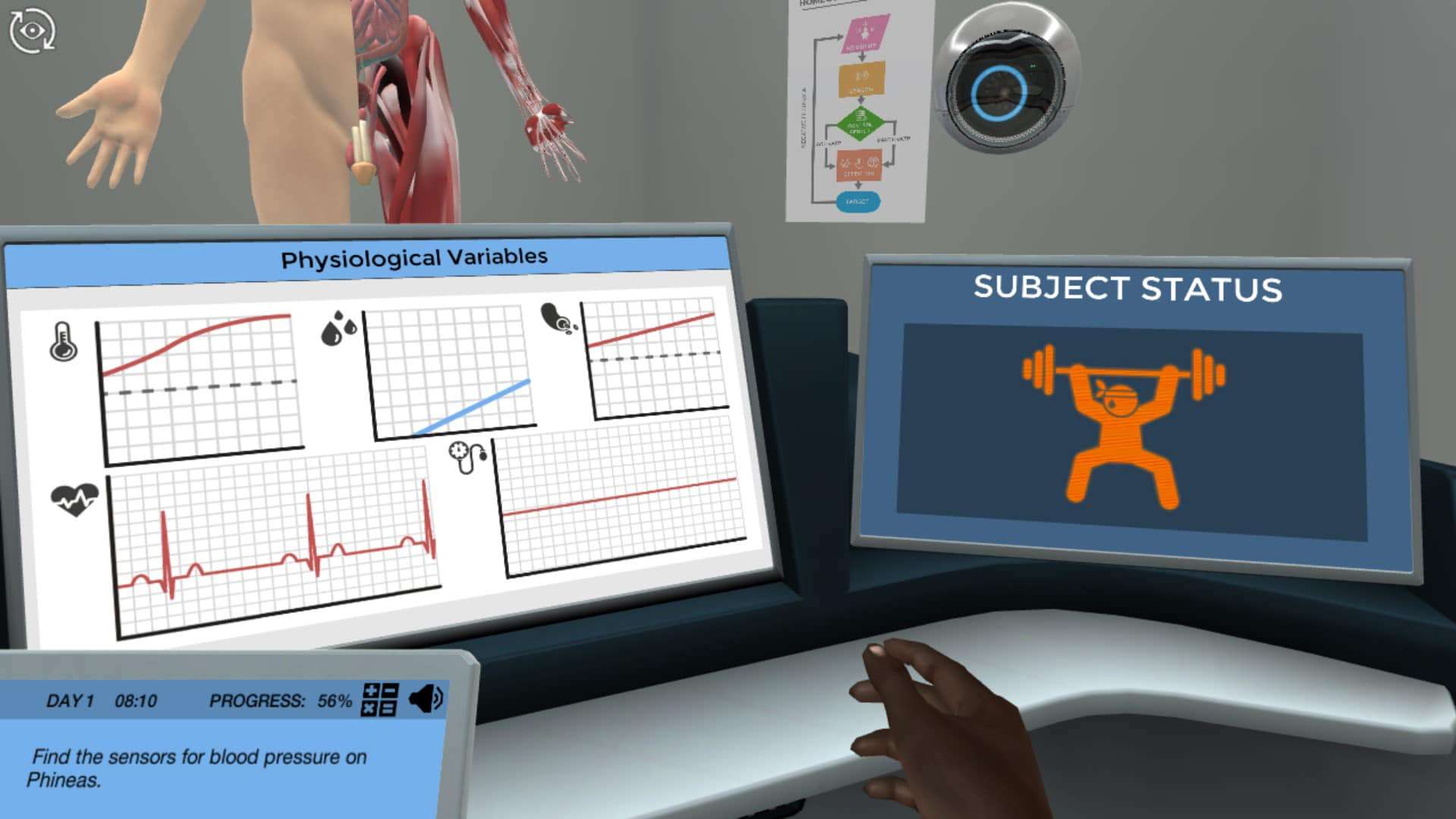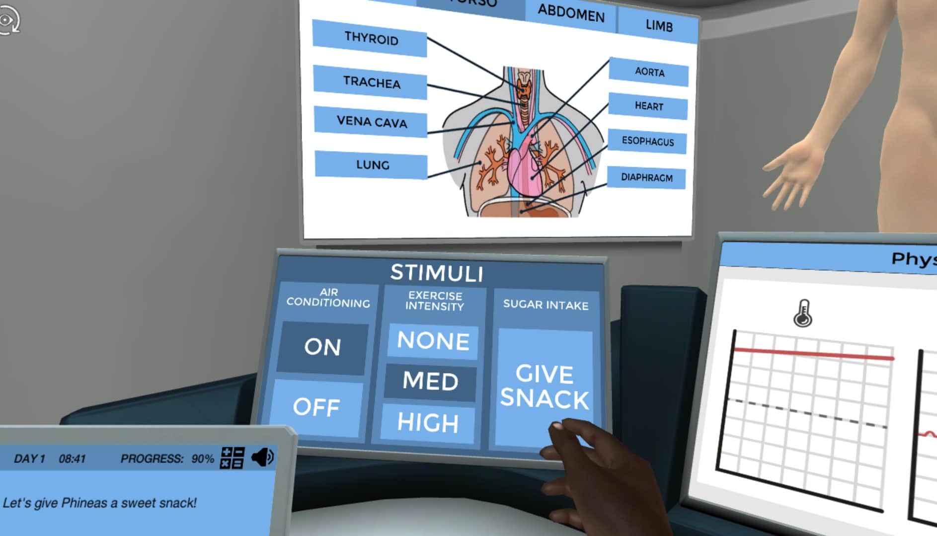 在我们的虚拟志愿者,Phineas上测试不同的设置:打开和关闭空调,让他练习不同的锻炼强度,并喂给他一些美味的含糖零食,同时观察他的身体如何对所有这些不同的刺激作出反应。从您的观察结果中,您必须找到检测刺激的传感器,控制中心处理它们以及作用作用的效果,以对抗它们在Phineas'的身体上。您还将分析刺激对基本生理变量的影响,如血压,心率,体温等等。