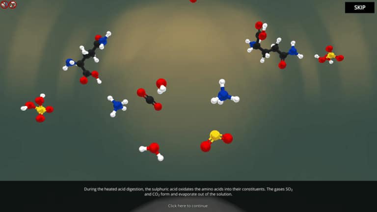 一个动画将向你介绍分析的每一步,并显示在分子水平上发生了什么。然后,您将执行酸消化、蒸汽蒸馏和最后比色滴定,然后挑战将实验室结果转换为样品中的蛋白质含量所需的计算。