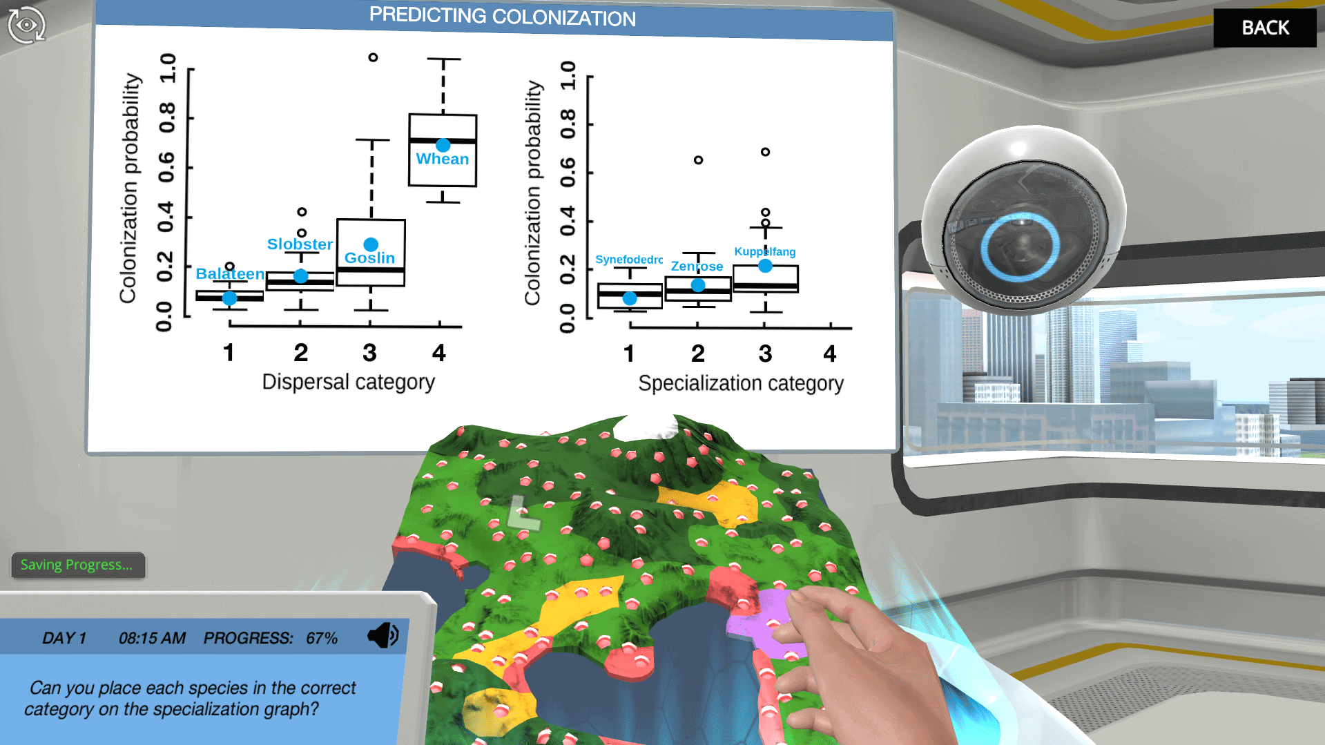 景观中并非所有区域都是平等的。当研究环境中的生态过程时,重要的是要记住,景观可能是空间异质性的。在这个模拟中,您将学习识别和比较系外行星Astakos IV上的独特斑块类型,并使用它们的特定特征来帮助理解当地的人口动态。生物工程师需要你的帮助运用景观生态学的原理来确定在阿斯塔科斯四号上的推进器物种是否处于危险之中。